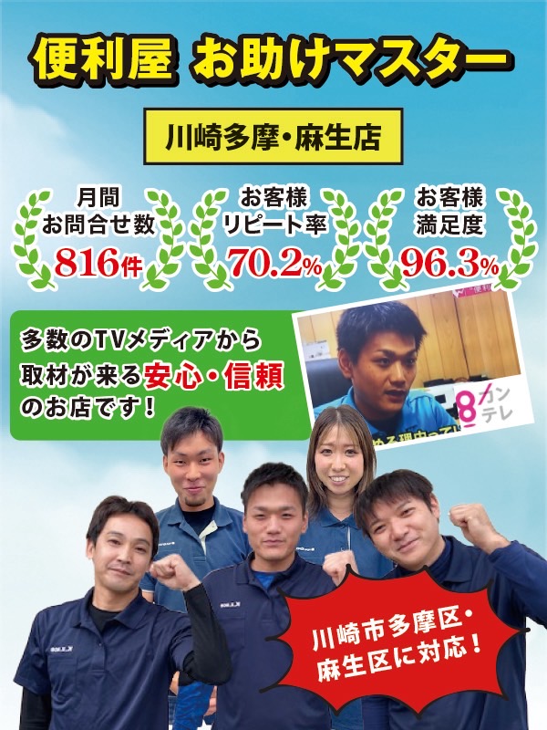 この度は便利屋お助けマスター川崎多摩・麻生店にご来店いただきまして誠にありがとうございます。当社では「格安」を売りにしているわけでは無く、決して大手の便利屋さんでもありません。しかし、そんな中当社をお選びいただけたお客様には必ず「選んでよかった」 と言っていただけるサービスのご提供をお約束いたします。